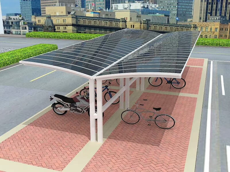 鋁合金自行車車棚骨架和板材顏色可選,設(shè)計造型美觀,融合歐式浪漫優(yōu)美弧度,簡約時尚的設(shè)計風格,帶水槽和排水管,安裝方便。