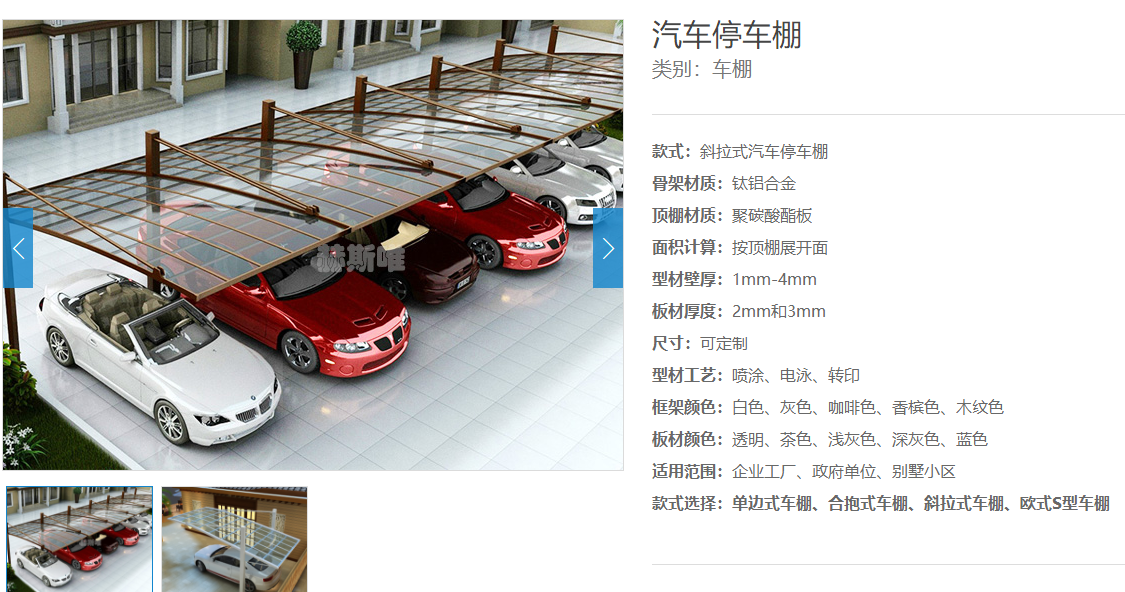 鋁合金車棚以鈦鋁合金為主體骨架,表面噴涂靜電粉末,以達(dá)到抗腐蝕的效果,棚頂還采用可以吸收紫外線的聚碳酸酯的面板,可以很好地保護(hù)汽車。
