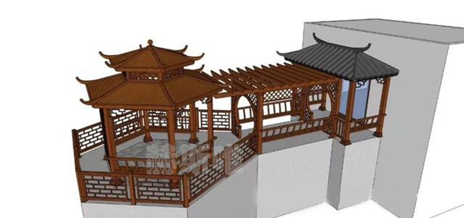 廊是亭的延伸,是聯(lián)系風(fēng)景景點(diǎn)建筑的紐帶,隨山就勢(shì),曲折迂回,逶迤蜿蜒。廊既能引導(dǎo)視角多變的導(dǎo)游交通路線,又可劃分景區(qū),豐富空間層次增加景深,是中國(guó)園林建筑群體中重要組成部分。