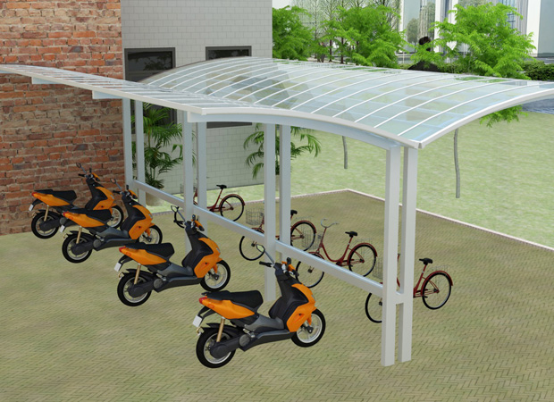 自行車停車棚頂棚采用進(jìn)口聚碳酸酯板,抗沖擊是玻璃的數(shù)百倍,有效防止高空墜物