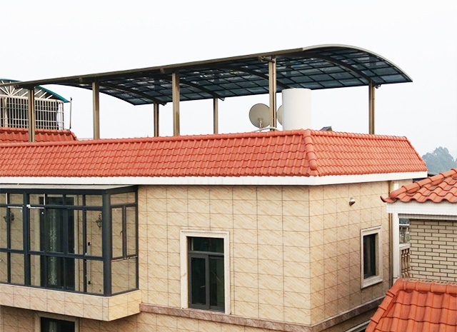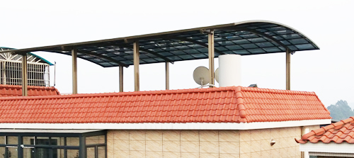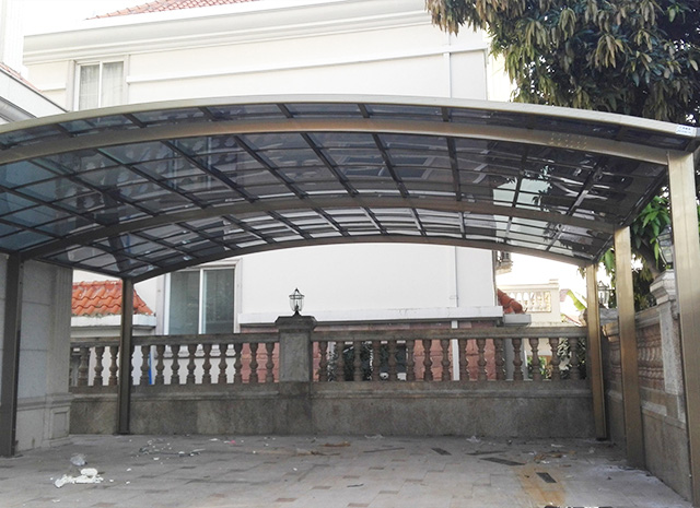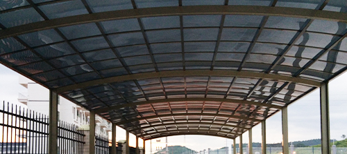 頂棚采用進(jìn)口聚碳酸酯板,抗沖擊是玻璃的數(shù)百倍,有效防止高空墜物